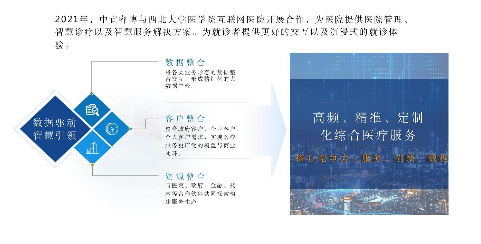 中宜睿博在在15+城市建立互联网医疗服务管理模式,形成智慧医疗,数字化管理。